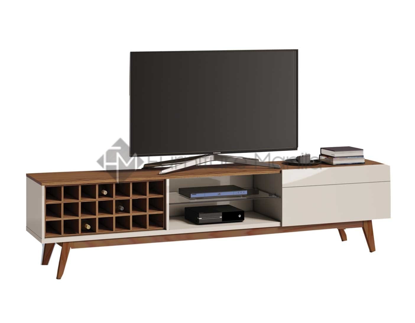 Modern Tv Stand With Wine Rack And Splayed Metal Legs In Off White And Cinnamon