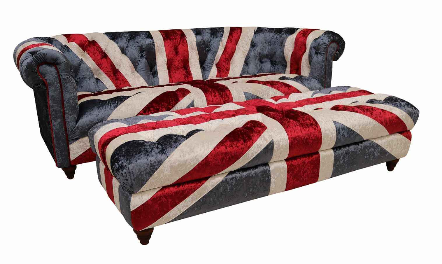 Union Jack Chesterfield 3 Seater Sofa With Matching Ottoman Footstool In Plush Velvet