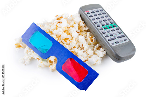 3d Glasses And Popcorn Tv Remote Board On Isolated White